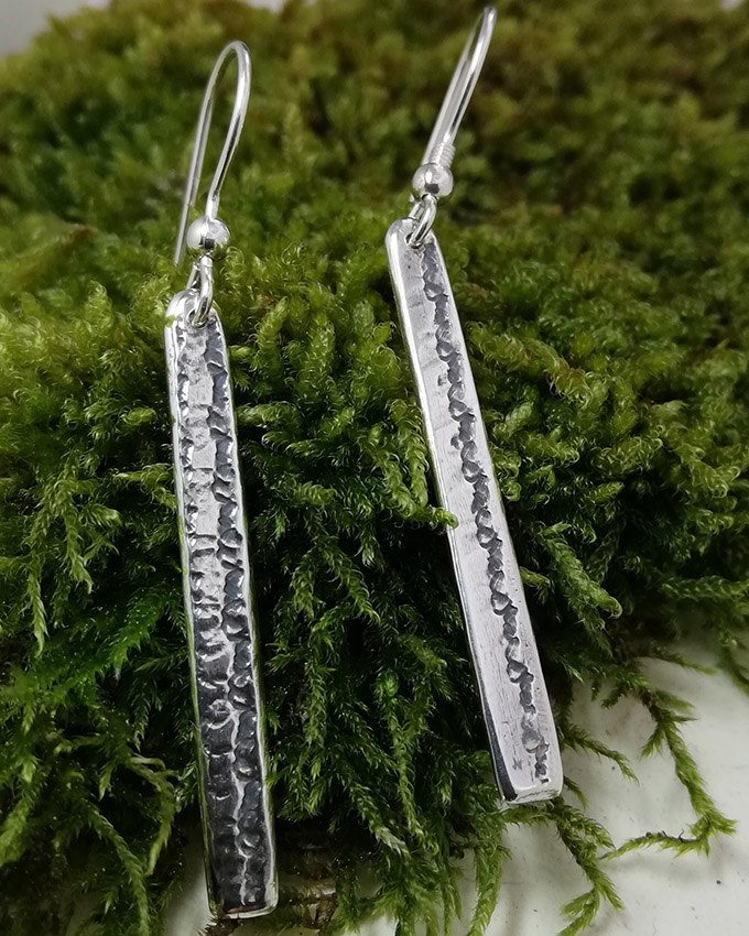 Boucles d’oreilles en argent massif, laminées avec un motif en tissu, relief noirci
